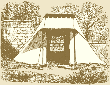 Qualities. ---Edgington's tent stands very firmly, and is undoubtedly one of the best single-roofed tents now used. Its chief fault is, that its pointed form and the pitch of its roof are such that it must always remain a single-roofed tent; no awning can be placed over it. This fault it has in common with conical tents. It has also, although in a less degree, a fault peculiar to them, as also to all tents with sloping walls---a want of space in the upper part of the tent, with a waste of space in the lower part. Moreover, the two storm-ropes by which the tent is stayed are highly inconvenient. They are fastened just where such ropes should not be---obstructing the entrance of the tent. One or two straggling ropes attached to a tent are a cause of accidents more frequently than the numerous stay-ropes of a marquee or wall tent, which may be seen, and thus avoided.