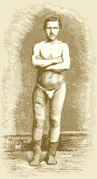 CASE 4.---Private Jules Hardy, 3rd Company, 2nd Battalion, 35th Regiment of the Line, was received September 30th, 1870. His injury was a fracture of the middle third of the right femur, the central portion of' the shaft being shattered through a length of fully five inches. The ball entered posteriorly about the middle of the shaft, was split into two fragments by the fractured bone, making two exits anteriorly. The patient on arrival was much weakened from loss of blood. The limb was shortened about five inches, and was distended to its utmost capacity by an effusion of blood within the fascia lata. The limb was placed in a gutter padded with oakum, and covered with hot-water applications and oil-silk, and extended and counter-extended, as in Case No. 3, before described. During the whole course of the treatment quinine and iron were given. October 20th, twenty days after the injury, a fragment of bone, constituting the entire thickness of the shaft, was removed. October 25th, a second piece, similar to the former one, was removed during suppuration. The periosteal sides of both fragments were entirely smooth, showing that they had just been detached from the periosteum, while the other presented a worm-eaten appearance. The bone was found to be consolidated about November 10th. November 17th, pretty firm union; no lateral distortion; fully two inches shortening; no thickening except the fragmentary consolidation. December 2nd, one of the anterior wounds closed. December 15th, the posterior wound closed, but re-opened December 26th, at which time, upon careful examination, pieces of dead bone were found firmly attached. January 15th, a small abscess formed and was opened near the seat of the fracture. January 20th, the limb was found to be firmly united, with about two and a-half inches shortening. At this time extension was taken off, and the whole limb and foot were bandaged to sustain proper circulation. January 25th, gastric irritation set in with severe vomiting; for three days the patient was unable to retain anything on his stomach except champagne and ice. After that attack his health returned, and he continued well up to the 5th of February, when there was more gastric irritation, but of a milder form. Stimulants and milk were then administered with success. February 10th, he was able to sit up for a few hours a day. February 14th, he was able to bear, without inconvenience, much weight on the injured limb. February 20th, his face and body were somewhat dematous; his urine was examined and found loaded with albumen. Appropriate remedies were given to combat the disease. There was steady progress up to March 4th, the patient continuing to walk with crutches. still albuminous, but limb well and strong. On the 7th there was very considerable oedema of the legs, giving to the wounded limb the appearance of deformity. A photograph was then taken of the patient, a woodcut from which is here appended (Fig. 53). On the following day the oedema had disappeared, though the urine was still heavily loaded with albumen, and he left for his home in the country, well, with the exception of the diseased action of the kidneys.(9)