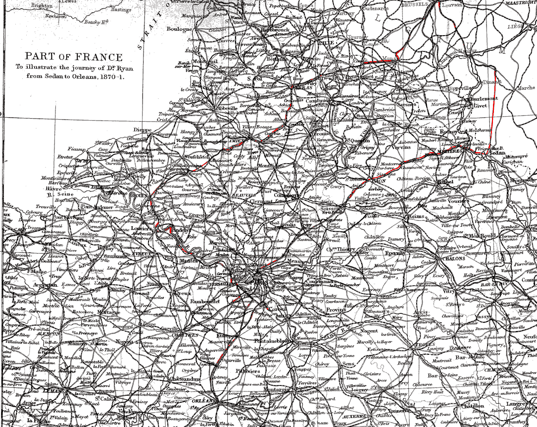 I had no alternative but to pack up and start next day, which I did by the morning train on Jan. 31st. On reaching London, I called at the English Society's rooms in Trafalgar Square, and reported myself to Colonel Lloyd Lindsay. Mr. Pearce, the secretary, made me known to Captain Burgess; and I met there my confrère, Dr. Frank, who greeted me cordially, and sent many affectionate messages to his former colleagues. It will be remembered that Dr. Frank was chief of that section of our Ambulance which had a hospital at Balan and Bazeilles, and which afterwards established itself at Épernay, where it worked for some months before disbanding.