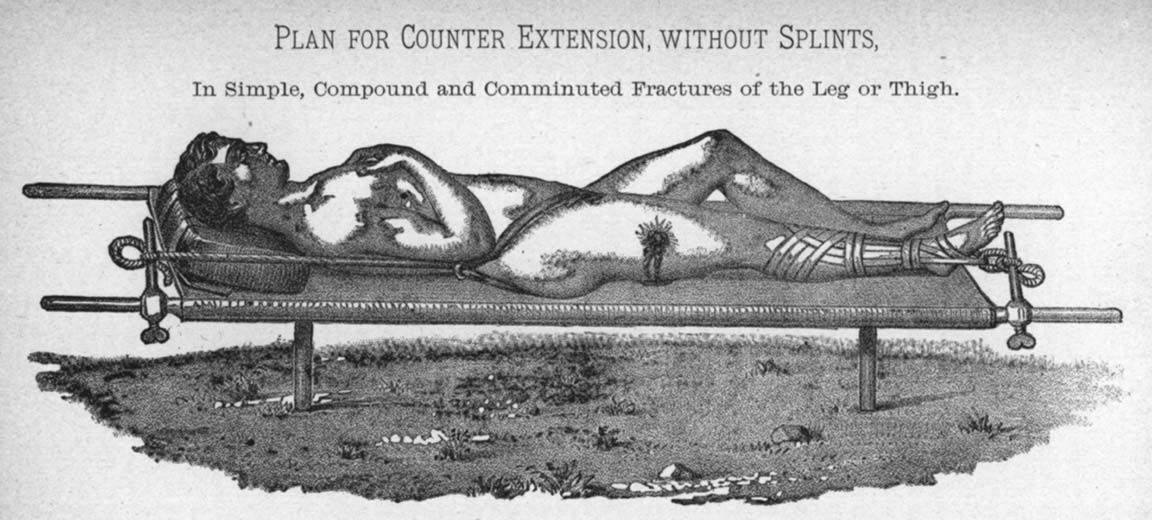 "By means of a common brancard ("stretcher ") ingeniously arranged by Dr. Swinburne, a soldier or officer with gunshot fracture of the femur can be carried with an advancing army over any extent of country. Upon one of the handles at each end, a bent iron arm, having an eye at one end, was fixed by means of a screw. It admitted of being moved along the handle, or from one end to the other, according to the seat or side of the injury, and, from those at the head and foot of the extension and counter-extension, could readily be used. A mattress adapted to the dimension of the brancard being provided, transport of a wounded man can be readily effected, either by means of two brancardiers ("carriers") or by placing the litter upon a wheeled conveyance. The contrivance is further so suggestive in regard to a convenient method of securing patients with fractured thigh-bones on shipboard, that it is commended to the notice of surgeons at sea. By means of a staple eye secured in the bulkhead, at either end of a bed, immobility of the ends of a fractured femur would readily be insured."