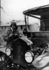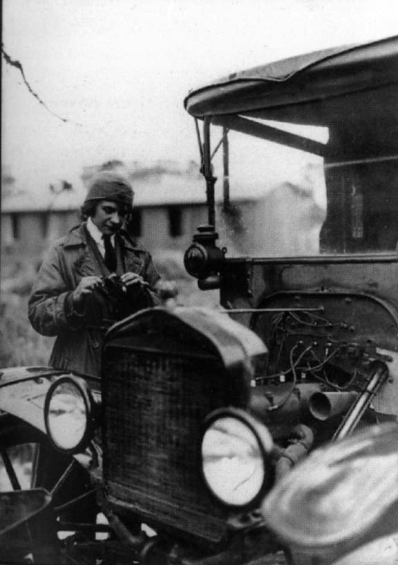Woman driver of the American Committee for Devastated France (CARD) repairing her car (cat. 115). The American women, having resolved to bring their support wherever it was necessary, astounded the French by their determined conduct and by their incursion in domains reserved for men. |