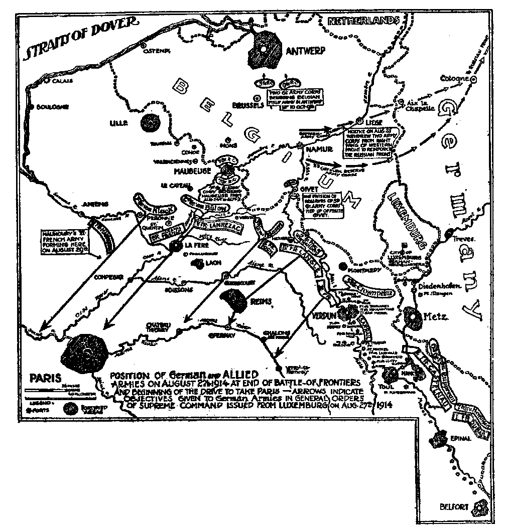 This seeming contradiction between direction of march and strength of armies is entirely explained by the fact that the general orders of August 27 were based upon conditions utterly unlike those actually prevailing. The supreme command labored under the delusion that the hardest part of the campaign on the western front was over. The retreating enemy was expected to fight furiously and make a stand at every suitable location, especially along the rivers.