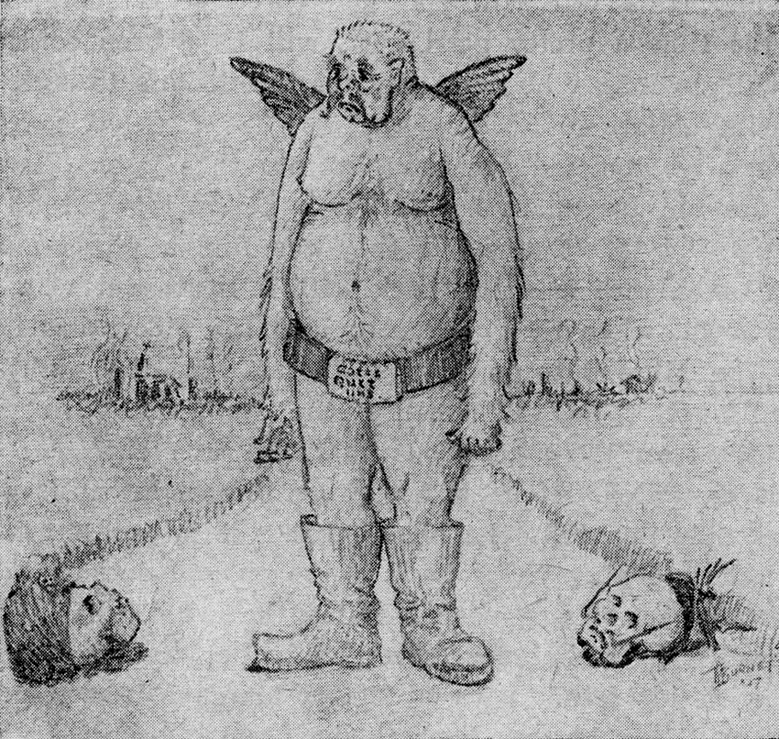 "NO MAN'S LAND" A desolate stretch, seared and bare, Between the trenches, dark and grim, Yon heap of stones so faintly seen, Tangled wire snares, barbed and sharp, Where ghosts of men stalk at night H. C., S. S. U. 9. |
