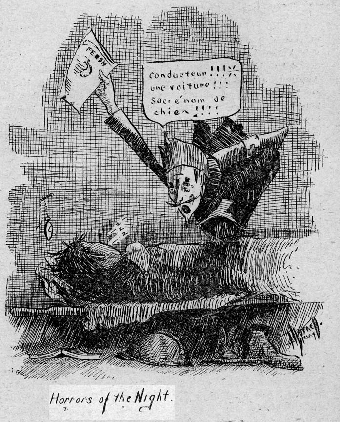 The Arab has now caught the Annamite and the running noise has been succeeded by Indo-Chinese howls accompanied by gutteral mutterings ordinarily swept by "Sahara" breezes. The French cook has entered and is showing his comradeship for les Américains by slapping me on the back while the French jazz band has burst into "Tipperary" with meaning glances in my direction. A Belgian from another ward comes running in excitedly his fingers placed on a certain word in a certain hook. He shows it to me. The word is cow-boy. I nod nonchalantly whereupon he works himself into a feverish state and makes sounds approximating "boom boom, wow wow and moo." He then darts out and reappears with a gentleman built along the same generous proportions as Jess Willard, explaining the new entry with the remark "Il connaît la boxe. " The herculean personnage is about to grab me and I shall continue when he has finished. Jess is all thru now and outside of a black eye and slightly bloody nose I am well. A Frenchman has shoved a "Vie Parisienne" in front of me and is pointing to the limb of the girl on the magazine cover. Im sure I don't know what he expects me to do.