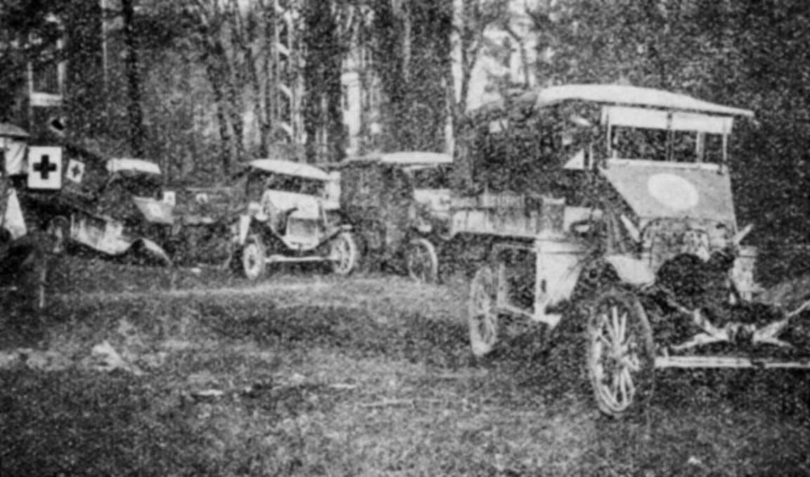 A corner of the park at 21, rue Raynouard showing cars destroyed in service, whose donors live in New-York, North Carolina, Illinois and California. These cars have performed good work in various ambulance sections. No 737 in the foreground was destroyed at Mornzeville while Section 29 was doing the run to Mort-Homme. The others in the background come from Sections 12, 13 and 19, their condition results of collision or wear and tear of a year's service at the front.