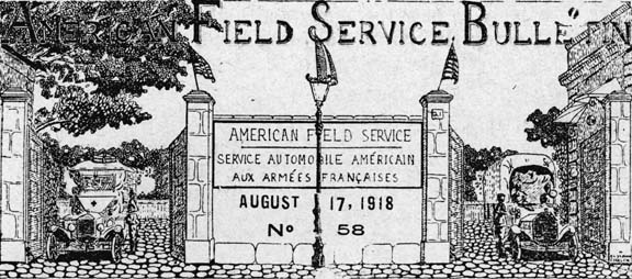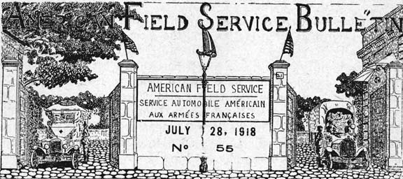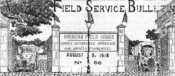 I am proud of my short connection with it because of the name and reputation the American Field Service bears, and because it was a volunteer service conceived and opened to us in advance of the main Army of Americans coming across. Dozens of the same dirty old "hunks-a-tin" whirl past our camp every day, and they never fail to stir memories of the old days when I steered "32908" about the rough roads and dirty villages of northern France, with a bit of affection for the ambulance and fellowship for the driver.