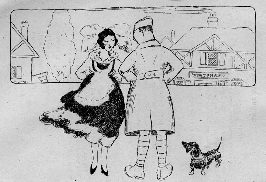 Lou-lou, our faithful hound, still howls just as joyfully at the morning roll-call whistle and on account of his weight is the recipient of envious stares from the eyes of greedy and meatless Germans who picture him as coming out of a sausage grinder in the form of a long roll of ground meat. Twice he was stolen but always mysteriously appeared with several broken ropes dangling from his neck.