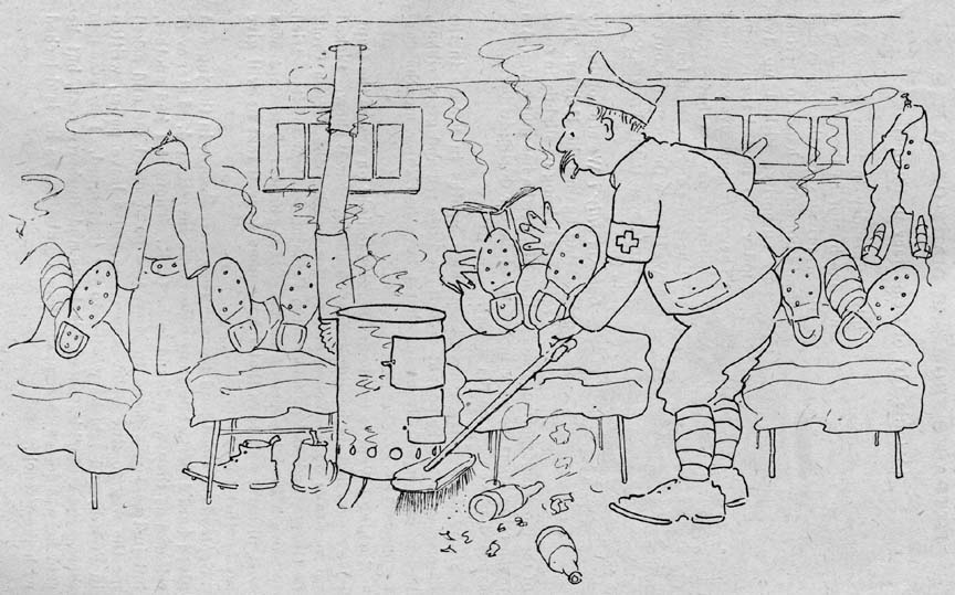 We installed ourselves in a German officers barracks ; with separate rooms and electric lights, huge german tile stoves --- including lots of coal --- a sight gratifying to the ambulance man's heart. The ambulance man can best exhibit his sang-froid when he has a good stove and lots of coal. Beds and spring mattresses from the nearby Kasern added to our comfort, while a few "voitures Ford" served to empty a former German officers' club of its equipment, including electric chandeliers, chairs, and a sectional bookcase, Numerous German lithographs, and pictures of Ludendorf and Hindenburg, German war loan posters, and the like served to decorate the walls --- not to speak of an original drawing representing something or other, "Die Klippe" --- found by the Great Nyetch, and claimed to be a fine example of Modern German Art!