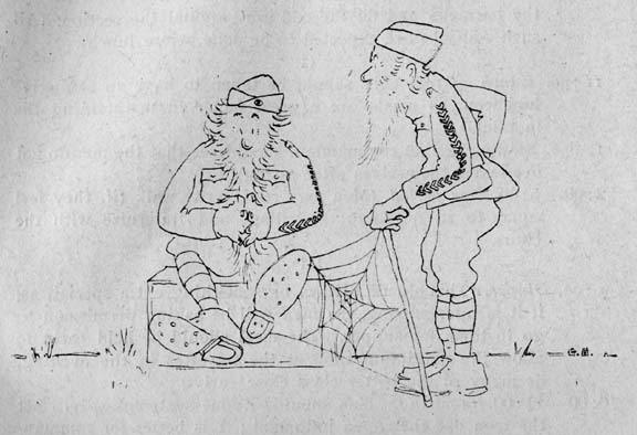 But the good days were gone. Poor Simp will never forget the day they gave him a pair of pants, a shirt, a red sock, and told him to salute all officers, even his own chef!; not to drink strong liquors, to take morning exercises, etc. ; in return for which he would receive 33 beans a month with the rank of private. One sous-chef went to Meaux, and when he came back he called the chef "Lieutenant," and himself Sergeant 1/c. The other sous-chef stuck around and helped the Chef master his new Buster Brown boots.
