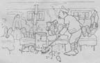 Long since Simp has grown accustomed to his fate, and not being bothered by ambition, he plods thru the weary days perfectly content to spend his time watching the stove and smoking his pipe. He sits by the fire by the hour, thinking and smoking, sometimes just smoking. But if you catch him conversationally inclined he will give lengthy discourses on what to do when turned out of the army, how to live without working, and how to make liquor out of sawdust. He has also become a philosopher, as the following words of wisdom which have fallen from his lips will show.)
