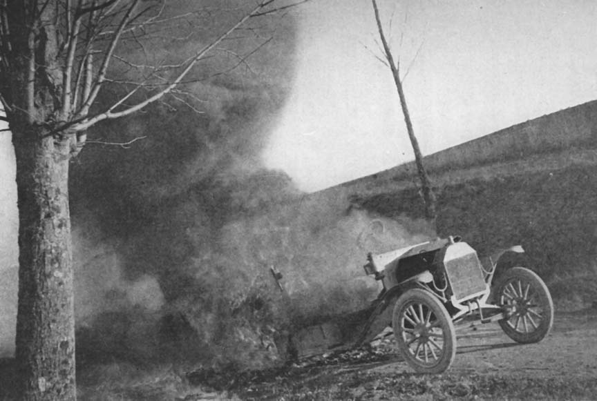Cuissy, our artillery poste, was a different affair --- a cave hollowed out in the side of a cliff high on a plateau. There were two routes to it, one the road up over the plateau from uilly, the other an old wagon-road across a field, through the valley and up a steep slope --- a constant succession of shell-holes and, on rainy days, almost impassable. Though we made some twenty-five or thirty trips to Cuissy we miraculously escaped without having a single casualty among the men, but we did suffer seriously in regard to the cars. There was scarcely a car among the twenty Berliets but showed traces of its Cuissy trip, the damage being anywhere from the complete demolition of the ambulance to having a horn or a fender ripped off by éclats. Car 10 made a memorable night trip, with Lowes and Hawley Smith as drivers, in which the car was punctured with thirty-seven éclat holes and neither driver was hurt. Car 1, while its drivers, Page and Tallmadge, were standing only a few feet away, received a shell through the top, which, curiously, did not explode, and after going through the seat and tool-box, buried itself several feet in the ground.