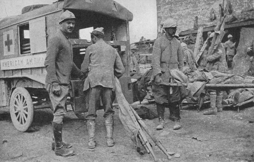 There is no need to tell of the ride in convoy, twenty cars following one behind the other, and every driver from the second car to the last damning the one in front for raising so much dust. Most of the things usual to gasoline cars happened, but at six-thirty that night the H.O.E. at Bouleuse --the evacuation hospital behind the Aisne front, where we were destined to pass our whole existence while members of the American Field Service --- saw twenty ambulances pull into the hospital grounds and forty-two dusty individuals crawl stiffly forth. Inside of five minutes every blessé able to walk, crawl, or to be assisted, was on hand to welcome the "américains" and to sell briquets.