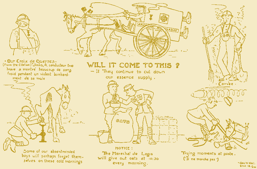 Staff cars contain from two to six officers --- which explains many of their eccentricities. Of course, it is of the utmost importance that officers should be moved quickly --- especially when they are headed for Paris on their permissions. Many a battle has been saved by the speed of staff cars---and by their breakdowns. If Sheridan had had a staff car he could have taken a little run up to Cleveland for a cocktail before he started on his ride --- unless the poilus had been tapping his gas-tank for their briquets.
