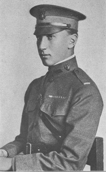 In September, 1917, he returned to America and, finding himself too young to be accepted at any officers' training camp, re-entered Harvard where he became a member of the Harvard Regiment. But his eager heart was overseas and, as soon as he became of age, he enlisted at Camp Upton, graduating early in April as an officer candidate.