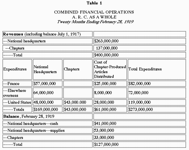 The following table shows the revenues and expenditures of chapters and national headquarters combined for the twenty months ending February ~8, 1919, round figures being used for simplicity: