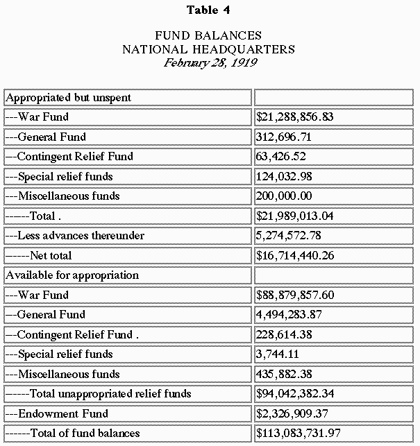 On July 1, 1917, the national headquarters had balances in relief funds aggregating $3,134,904.33. During the twenty months ending February 28, 1919, revenues aggregated $260,002,589.34, producing a total of $263,137,493.67 available for appropriation. From this amount $169,095,111.33 was appropriated, leaving balances in relief funds on February 28, 1919, aggregating $94,042,382.34- This balance, now substantially depleted by appropriations made since February 28, consisted of cash and securities $41,339,337.67, and supplies $52,703,044.67.[Note: Includes cash necessary to liquidate supply contracts.]