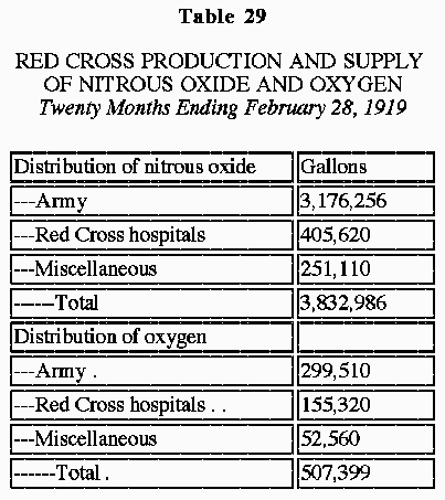 The Army also relied on the Red Cross for its full supply of nitrous oxide and oxygen. (Nitrous oxide is a new and improved anaesthetic, particularly valuable in cases where patients are too weak to take ether.) The Red Cross met this requirement by means of shipments from America and the organization of production in France. No charge was made for this service.
