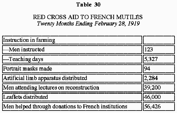 The relief of French mutilés included the operation of a school farm, the manufacture of portrait masks and artificial limbs, the operation of an educational and publicity service, and assistance to French institutions offering commercial and industrial courses to mutilés. It is estimated that 6s,000 of the 600,000 crippled French soldiers were reached by the Red Cross. Statistics concerning this work are given in the table below: