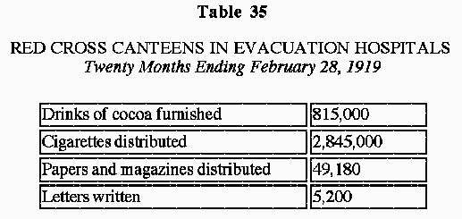 The Red Cross conducted sixteen canteens in evacuation hospitals of the United States Army. This service distributed refreshments, furnished special food for the sick and wounded and operated rest rooms and recreation houses. Every United States sanitary train was visited, and cigarettes, gum and cocoa given to each individual. Statistics concerning this work are given below: