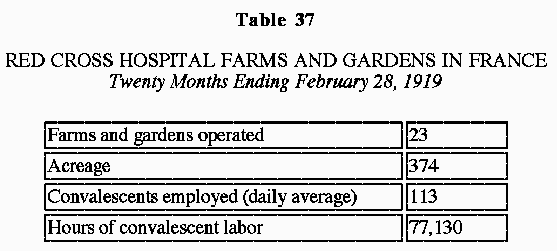 This phase of the work included, among other things, the operation of hospital farms and gardens which served the double purpose of furnishing healthful exercise to convalescent soldiers and providing the patients with fresh vegetables. Statistics showing the nature of this work follow:
