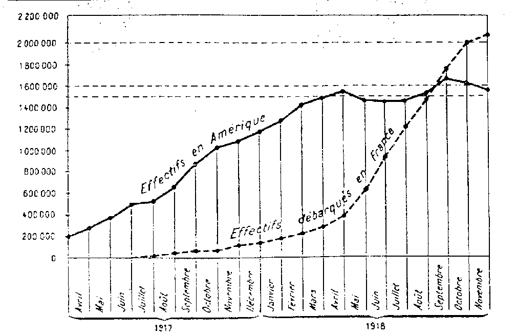 Despite the hopes raised by this first disembarkation, the troop strength of the AEF progressed very slowly. At the beginning of the month of November 1917, or seven months after the United States' entry into the war, it numbered less than 80,000 men, of whom only 50,000 were combatants.