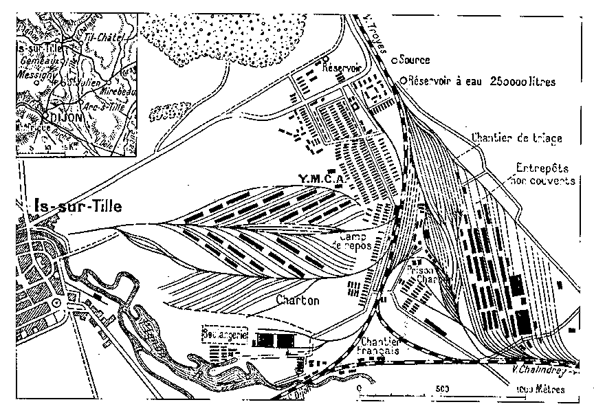 Within this arrangement, one should take note, in Burgundy, of the "fundamental base of the American Expeditionary Corps, the great advanced base number one and its regulating station at Is-sur-Tille, which came to the fore in October 1917. More than two million American soldiers and around four million tons of supplies passed through Is-sur-Tille between the fall of 1917 and the summer of 1920".(3)