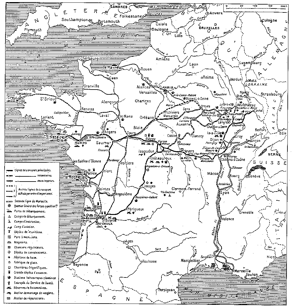 Some of the most important elements taken into account by the American services in establishing these centers were: adequate railway location and access, with connections to the base hospitals, the possibility of using common buildings (offices, storage, garage, bakers, cold storage, post, telegraph and telephone office, fire department, laboratory, chapel, morgue), the construction of roads and means of improving sanitary conditions, water resources, sewers and lighting systems.