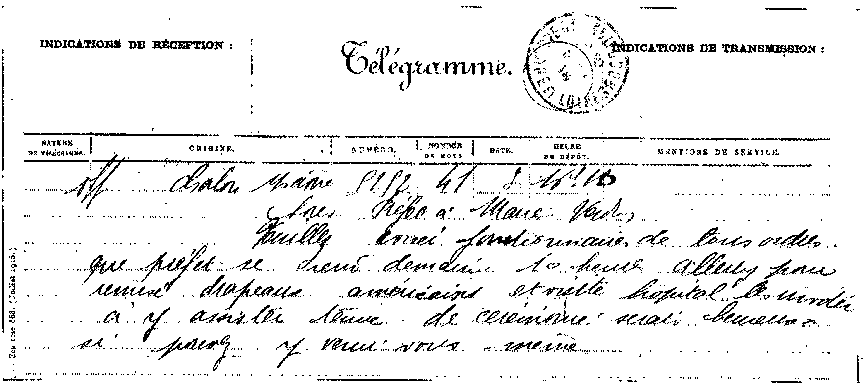 In giving the flag to the American troops, the Prefect said that for a long time he had wanted to come greet our American friends, but overwhelmed by his work, he had not been able until now to accomplish this duty; he was happy to see this great enterprise be completed and was happy today to come in the name of the Government to pay his respects to America's independence.
