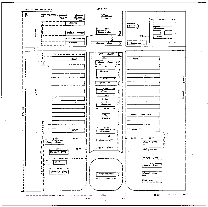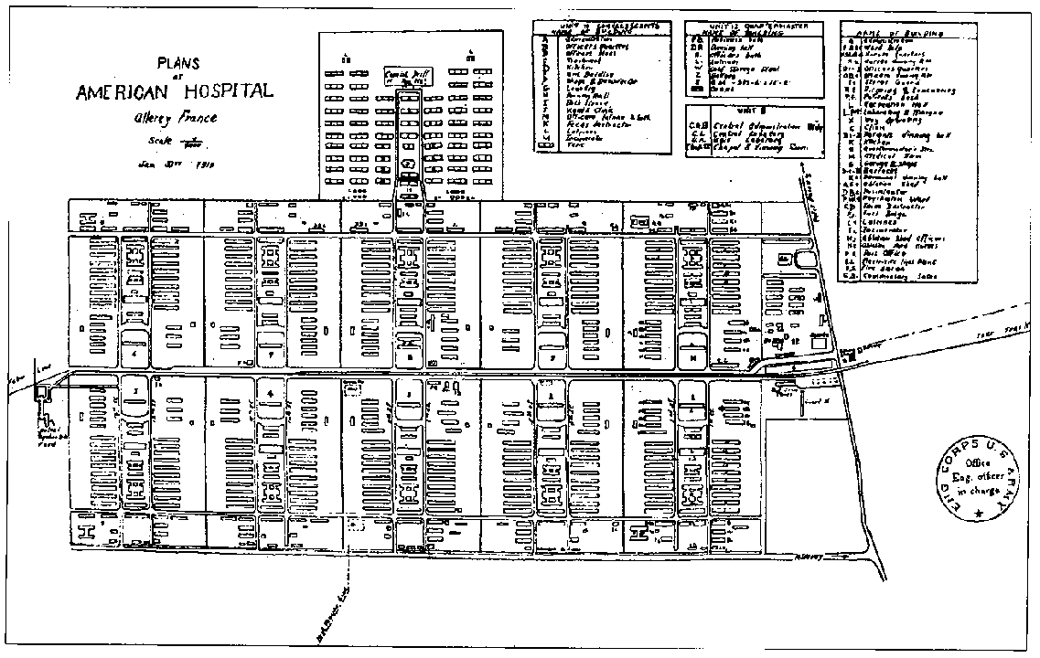Conformément aux directives du Haut Commandement, les Centres hospitaliers américains étaient construits selon des plans standards. Ils étaient divisés en sections quadrangulaires identiques, en nombre variable selon leur importance.