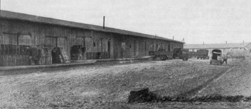 A l'extrémité Est du camp, à l'entrée de l'embranchement de la voie ferrée (voir plan), la section de la Direction et du transport automobile comprenait l'entrepôt (de 120 m x 15 m), la manutention, la glacière, les boulangeries, les baraques pour les travailleurs civils, le parc de stationnement, le garage, des ateliers, le poste d'essence, etc.