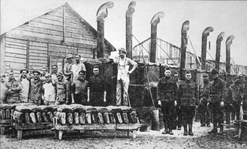 Le "Fire Marshall" (sous-officier chargé des feux) était responsable de leur installation. Il y avait toujours suffisamment de combustible en permanence, les stocks, en prévision de retards de livraisons, se montant à plusieurs milliers de tonnes. Le bois était livré par péniches au port de Chauvort où il s'entassait en tas énormes avant d'être emmené au camp par voitures, ou coupé dans la forêt voisine par des civils.