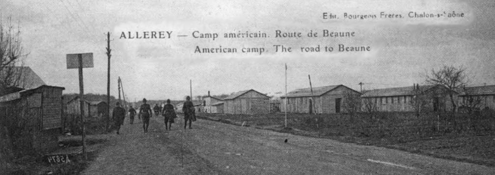 "ALLEREY --- Au camp américain. --- Le temps étant favorable, nombreux ont été, dimanche, les promeneurs au camp sanitaire américain d'Allerey, dont la construction commence à toucher à sa fin. C'est une installation grandiose et merveilleuse qui mérite d'être vue. Un certain nombre de blessés Américains y sont soignés depuis quelque temps déjà et de nouveaux venus arrivent de temps en temps. Le personnel sanitaire est composé surtout d'infirmières américaines. Des contingents d'officiers et de soldats se succèdent, c'est un va et vient continuel dont les commerçants d'Allerey et de Verdun ne se plaignent pas, non plus que les habitants qui prennent plaisir à entreprendre, dans la mesure de leur moyen, de petites conversations avec les Amex, qui sont du reste très sympathiques et d'une grande politesse. L'installation du camp sanitaire américain a changé du tout au tout la face de notre petite bourgade". ("Le Courrier" --- 13 août 1918).