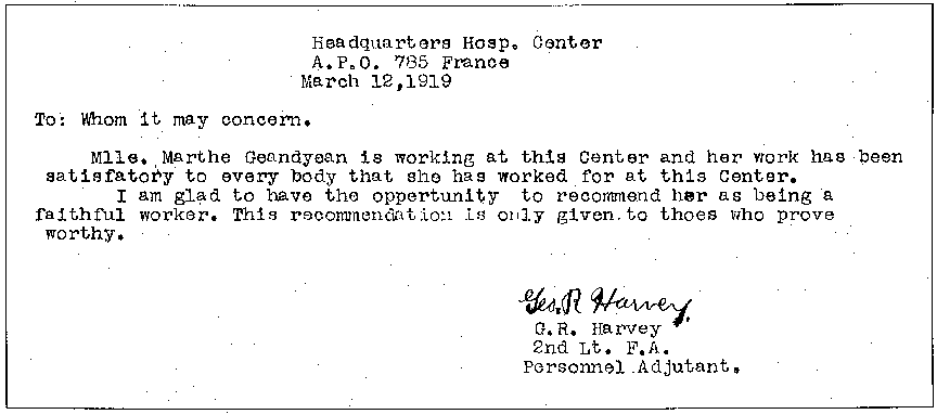 Au début, je me rendais à pied sur la place de Gergy et un camion américain bâché s'arrêtait pour faire le ramassage d'une vingtaine de femmes de Verjux et Gergy. J'ai d'abord travaillé dans une salle de blessés, puis au début de 1919, après le départ de ceux-ci, à l'entretien d'une salle de loisirs avec jeux de société, billards, buvette. Je faisais la vaisselle, les vitres, le nettoyage et le rangement du linge, le ménage des chambres d'infirmières, des cuisines, des bureaux, etc.