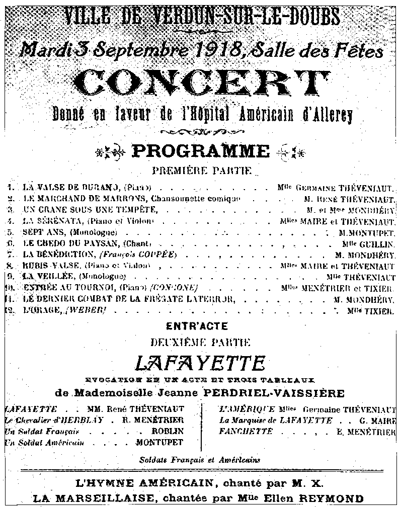 Le 3 septembre 1918, c'était les Verdunois qui organisaient un concert donné à la salle des fêtes de Verdun "en faveur de l'hôpital américain d'Allerey ", avec la participation de musiciens, chanteurs et auteurs locaux (programme ci-dessous).