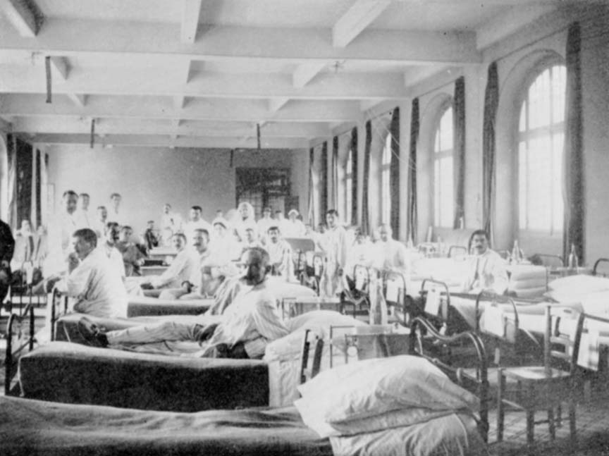 The hygienic conditions of the hospital have been most excellent, thanks to the painstaking efforts of every department. The clothing and effects of all patients are promptly disinfected or destroyed upon arrival, infected dressings and refuse are incinerated or sterilized, wards and corridors are constantly ventilated and cleaned, and the supply of drinking water is rendered sterile by ultra-violet rays. The success of these precautions may be measured by the fact that no epidemic of any kind has occurred in the hospital, and the further fact that the few sporadic cases of contagious disease have never spread to other patients.