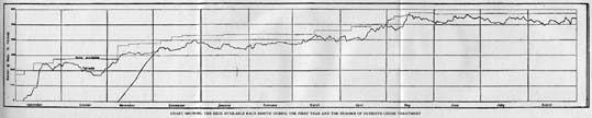The average daily cost of a patient, during the past year, was adversely affected by the fact that, during the months of September, October and November, 1914, the number of patients under treatment was very considerably below the capacity of the Ambulance. A large proportion of the operating expenses is naturally continuous, and independent of the number of patients under treatment. In this respect, attention is invited to the accompanying graphical chart, showing the number of patients under treatment on each day, and the total capacity of the Hospital.