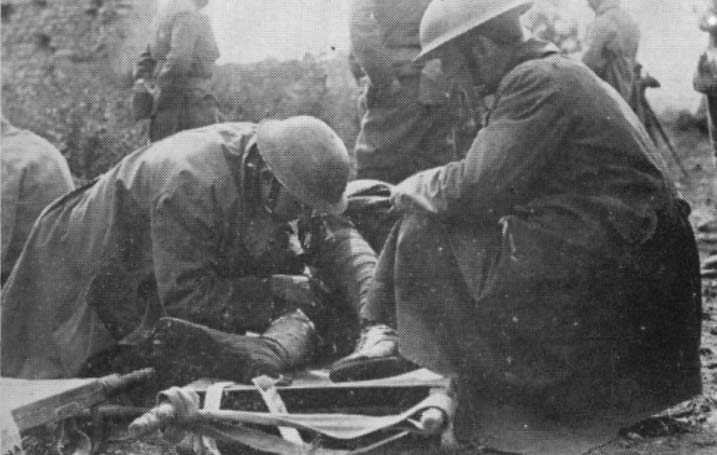 "The evacuation of wounded begins on the field, when members of the regimental medical detachment apply first-aid dressings and direct, assist, or carry the wounded men to aid stations. These regimental medical officers apply dressings and splints to prepare the patient for transport. The regimental medical detachments of fifty-five officers and men were not large enough to perform all these duties in times of heavy combat and eight to twelve soldiers had to be withdrawn from each company to assist in the work. Litter-bearers from ambulance companies took the patients from aid stations to ambulance heads or collecting stations, ordinarily the most advanced points which could be reached by ambulances; although whenever possible these went all the way to aid stations and thus reduced the heavy labor of litter-bearing. The headquarters of the ambulance company, where the bulk of its ambulances were stationed, was usually about a mile to the rear of the ambulance head. When a loaded ambulance passed these on its road to the field hospitals, an empty one started forward to replace it, and constant circulation was thus kept up until the field was cleared.