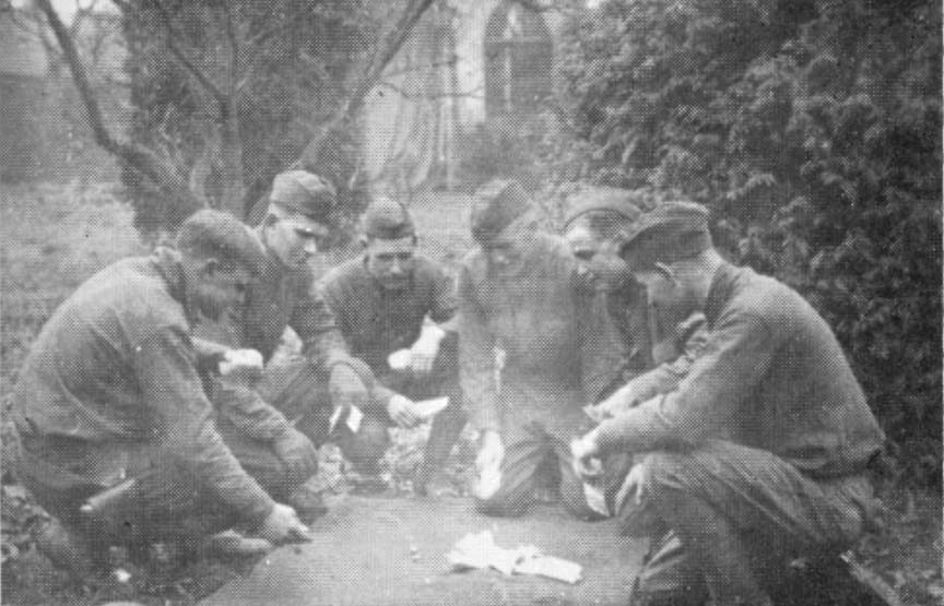 Whenever our train paused in a French village on the way to Meaux, we would be likely to see scores of little children and even women at the railway siding, waiting for us. The French no longer considered a troop train an unusual sight, but the American soldiers were indeed a novelty, and it was soon discovered that the American doughboy was by far the friendliest and most generous of all fighting men. Our men loved to poke their heads out of the windows or doors of the train to try to talk to the children when we stopped, and it was not long before French children learned a few English words that would serve them in good stead. Some of them begged for money, but others merely craned their necks and set up the shrill cry of "Chac-lat, chac-lat!" I still remember those odd cries of the little French children, and I remember, also, that invariably they were answered by our men with whatever kind of food or chocolate happened to be at hand, generously and with broad smiles of indulgence.