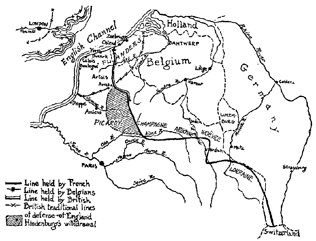 In the meanwhile General von Hindenburg had moved first, just as the French had feared he would. Secretly and so quietly that the French and British to their front did not find it out until the movement was well under way, the German troops had begun withdrawing from their trenches along the front to the northeast of Paris. Gradually the movement spread until it covered a front of approximately 125 miles.