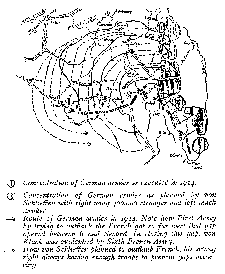 Until the Marne was reached, the plan had gone according to schedule. But when the French stood upon that river, the German right flank, under General von Kluck, did not have troops enough, as von Schlieffen had planned, to go to the west of Paris, thus turning the French left flank, getting in their rear, and bringing about a decisive victory. Instead General von Kluck in his endeavor throughout the French retreat to keep on turning their left flank, had gotten so far to the west that there was a gap between him and the next German army to his left, under General von Bülow. Therefore, instead of going to the west of Paris, he had to close in to the east in order to get in touch with von Bülow, He had to go so far east that he finished with Paris to the west of him instead of being to the west of it.