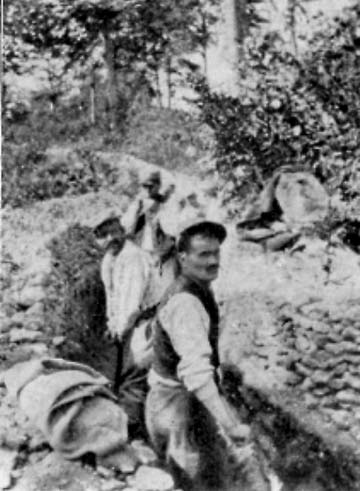 Yesterday I visited the trenches. I left here at four o'clock in the morning and started up the hill through a little village, rather like what the French call me, "Booseville," which has been much bombarded, and then climbed up past disused trenches until we came to a sentry who directed us up to the company where a friend had promised to meet me. At last I found him and we started for the "premier ligne." I felt a little nervous and anxious, as I did not care to get killed sight-seeing. My friend pointed out some bushes to me, and I had not noticed what he said, when on passing within a foot of another bush I found myself looking into the muzzle of a "75 " gun. For some distance every inch seemed full of great guns and little guns, all so cleverly hidden that it would seem impossible to know they were there. At last we came to a hill and were told by a sentry that we could not pass that way (for some reason or other ---perhaps the position of a battery had just been changed), and we had either to go straight back or right across a field three hundred yards wide in full view of the Germans, three hundred and fifty metres away. Said my friend, "Oh, I think they are eating now; let's risk it. They never fire while food is about." So somewhat against human nature I assented, and we slowly trudged across the open. I confess I was relieved when we reached the shady wood. Still mounting up, we passed hundreds and hundreds of blue-coated soldiers returning from their night vigil in the trenches, and then the noise and chatter of men and birds seemed to die away and I could hear little else but the crack of some twig one of us walked on, or the occasional bang of a rifle. This deadly silence --- it was really quite awe-inspiring --- continued as we passed silent groups of soldiers sipping coffee, tea, or soup. Then we took three or four steps down and henceforth walked in trenches, --- winding, curving, zigzag we went, no trench being more than five metres straight.