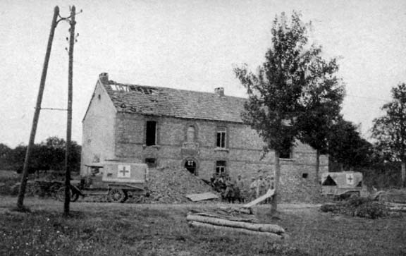 As a matter of fact, whenever he comes, we do seem to have a lull in the fighting --- why, I don't know --- but one of these days he will arrive when something exciting is going on. Up to the day before yesterday, one day seemed very much like another --- continual explosions of shells---"departs et arrives" --- collecting wounded, etc.; but last Thursday ("Doc" left on Wednesday) we had forty-eight hours of truly hard time. I was on day service at X----- ---a little village, as I told you, about one and one half kilos away, of one street about two hundred metres long and one church. I got up there at seven thirty, and, after taking two or three trips with wounded to Dieulouard, was returning to lunch at eleven o'clock, when an urgent call took me to Auberge St. Pierre --- a little poste de secour on the top of the hill past Montauville. I also wrote you about Auberge St. Pierre in my last letter --- to get there you have to go on an uphill road within uncomfortable range of both German and French fire.