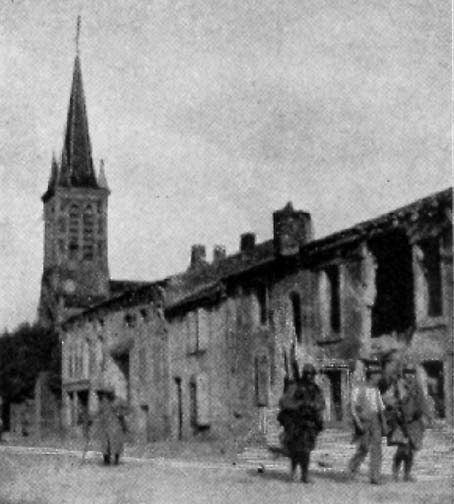 "Doc" has not yet arrived (he was expected Tuesday), so I am afraid you won't have heard from me this week, as he will miss the mail. I am sitting at the window of my bedroom with the sun streaming through on the table and can imagine myself at "Beauport," or the bungalow --- but every three or four minutes, boom! and then bang! ---boom! -the Germans firing on Montauville and the French replying. As I sit here I can see the smoke rising from the village, and I wonder if either of our ambulances which are on duty there have been hurt. "'Doc" may come to-night, and if he does so I shall make him come to X----- to-morrow, as it is my day's duty there and he will have some excitement. On my right I can see, about a thousand metres away, the German trenches. It is strange to sit at a window and be in such a position, and yet be writing a letter as though we were all together again in Gloucester. I have been very sick, but to-day I am better again and am very grateful for my recovery. Yesterday I discovered that the main backspring of my car was broken and I had to replace it. Imagine me on my back all day, working like a madman to get the job done in time for duty last night. I managed it all right, however, and so feel myself quite a mechanic. My old bus has a horrid habit of running forward when I crank it. I think I have more dread of cranking my car than of a German "obus." Last night I went into the Square to see the civilians leave. There are not a great many left, but the women are a nuisance --- morally --- and so the Governor is turning them out as quickly as he can. Alas, that they could not have done their part better! It was a sad sight --- many, many tears ---and some hysterics! The Governor, a splendid old Colonel, came up and talked with us (there were four of us), and was eager to hear when America was to join the Allies. He quite spoils us all, and anything we want he sees we have if it is possible. Last night it was amusing to see his indignation when he learned that we were paid, as ordinary "poilus" (a familiar term of endearment referring to the unshaven men in the trenches), a sou a day (we don't draw the pay!). He gallantly declared that we should all rank as sub-lieutenants and should be compensated as such, for he added, "You brave boys do as much as any soldier at the front and take as much risk." I like the French gallantry and sincerity. One meets it everywhere. The officers all salute us and the poilus all cheer, smile, and " vive l'Amérique," etc., and I feel that the work of the Section is real. I have rarely met a happier lot of fellows and all so good-natured and generous. You never hear a hard word. All work for the good cause, and as efficiency is unity we try to be efficient. I wish you could see this dear old garrison town with its poplars and bridge and church and the lazy Moselle slowly creeping along to quieter and happier places. Here and there are fallen houses --- and often gaps in the walls --- and torn-up trees. The house next to us has been hit and looks like this --