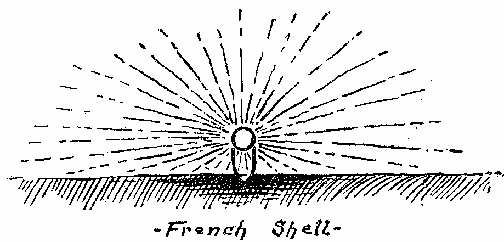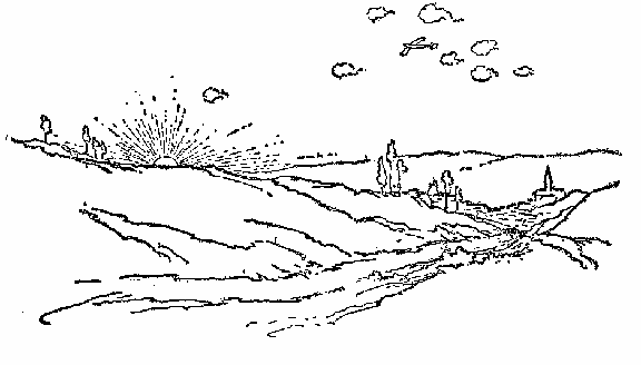 [*NOTE: This effect may be due to the fact that the German shells have percussion fuses whose action is less rapid than that of the French shells. This would allow them to penetrate the target or ground before detonation, and would give them the geyser effect sketched. In the French shells, with less delay action in the fuse, the explosion would take place more immediately on impact, giving a more lateral burst effect. Of course the delay in the fuses is easily varied by the gunners.]