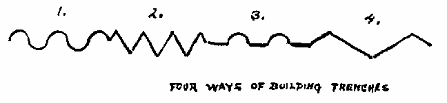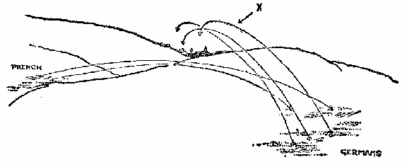 The rough sketch shows the indirect fire of the opposing batteries. Every means to observe the effect of the batteries is used, such as aeroplane spotters, etc., and these observers communicate by electrical or visual signaling systems to correct the fire of the battery.