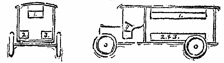 I am feeling pretty sick to-day and rather dread to-night, as I have all-night duty at X-----. I am not at all well. It is the hard food we are having, I suppose. Anyhow, I find myself nice and thin again, so your shocking example of gaining weight last spring is now of no influence. "Doc" comes to-morrow and I will give him this letter to post, as it would never get through unless posted in Paris. I have just returned from Belleville where I took three couchés and two assis. One of the couchés was raving and he yelled and shrieked the whole seventeen kilometres. It was horrible. When I arrived at Belleville, where they are put on a train and sent to a Base Hospital, I found that in his agony he had torn off his clothes and broken the hangers of the stretcher, so it was a wonder he did not completely fall on the two men below. Our cars are packed like this --