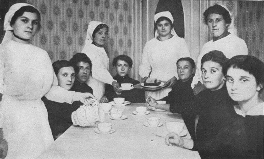 Every morning since the beginning of the war these women have been there, on their feet most of the time---sorting, arranging packages of garments, and keeping in their minds and hearts the hundreds of mothers and babies who depend on them. They often visit the homes after cantine hours. Madame smiled as she explained the necessity of a personal investigation of each case. "For, instance," she said, "if at the children's cantine I gave a youngster a pair of shoes simply because he seemed to have none, and without personally proving that he had none, I should undoubtedly have an entire barefoot family the next day!"