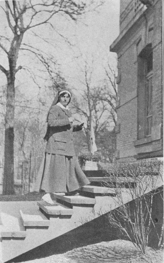 She was in her hospital at Compiègne when the news of the German retreat from Noyon reached her. At once she ordered out her ambulance and filled it with what supplies she had, and started, and was in Noyon a little more than twenty-four hours after the last German had moved out. Most of the houses she found destroyed, and all the furniture had either been taken away or made useless. There was not one pane of glass in the town or a stitch of clothing or household utensil left of any kind.