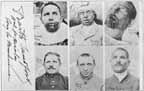 The photograph in the upper left-hand corner was taken May 2, 1916; the one below it shows the same man, after ambrine treatment, June 1, 1916. "He said that he did not suffer a single thing after the first and that he loved to have it dressed each day." The two middle photographs were taken June 21, and June 30, 1916, and the two at the right, September 21, and October 27, 1916. |