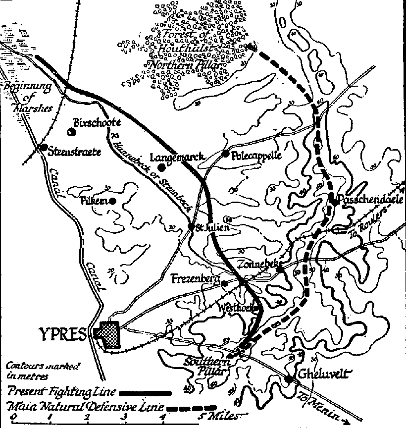 The topographical ground map represented an area of some 2 1/2 miles square beyond the July 31st line of trenches held by the 2nd Army with Hooge, Sanctuary Wood, and the Ypres-Menin Road to the right; and to the left the Ypres-Roulers railroad as far as Zonnebeke. Zonnebeke and Gheluvelt, lying somewhat beyond the map, were represented merely by signboards with the towns painted on them. On a scale of 1/50 horizontal and 1/12 vertical all the trenches were laid out by colored strips, almost every cottage, the woods, the little elevations--all very familiar names---some, like Westhoek, now ours, some not yet ours. "Inverness Copse," the Polygone de Zonnebeke, "Clapham Junction" on the Menin Road, and so on.